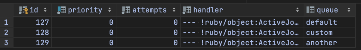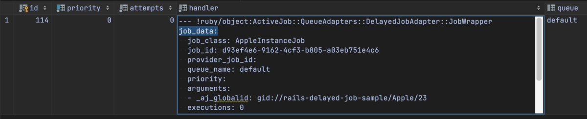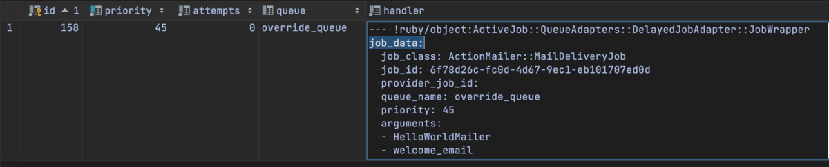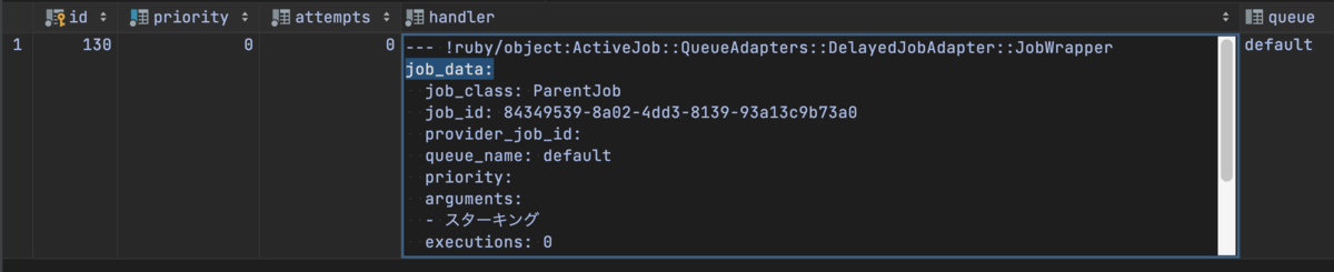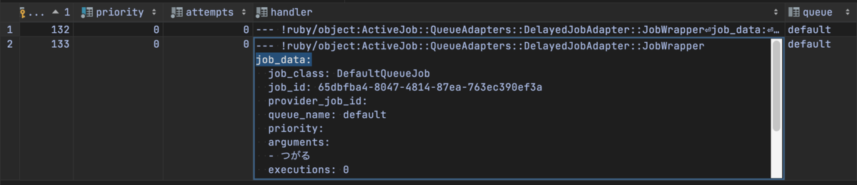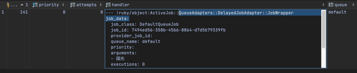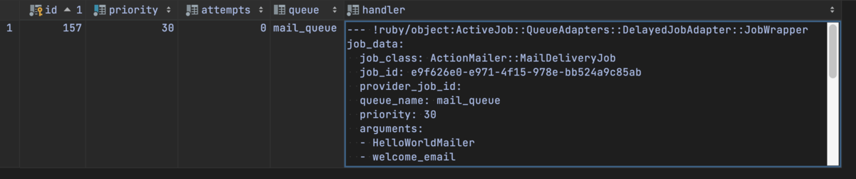 delayed_jobs テーブルの中身を見ると、データが登録されています。