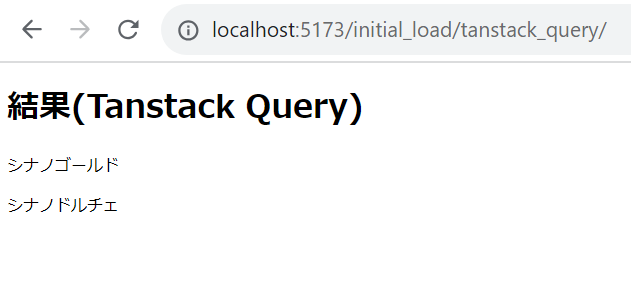 import {useInitialLoad} from "../../../hooks/useInitialLoad"; const Page = () => { const {data, isLoading} = useInitialLoad() if (isLoading) return <div>Loading</div> if (!data) return return ( <> <h1>結果(TanStack Query)</h1> {data.apples.map((a) => { return <p key={a.id}>{a.name}</p> })} </> ) } export default Page