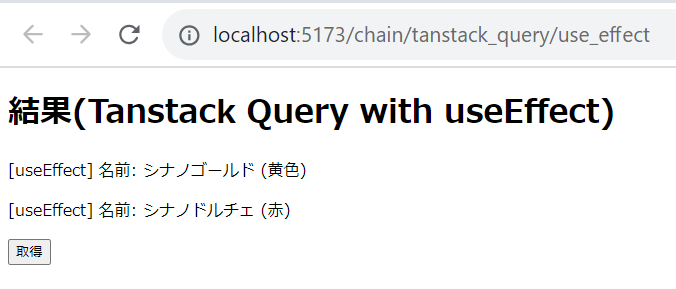 import {useClick} from "../../../hooks/useClick"; const Page = () => { const {data, refetch} = useClick() const handleClick = async () => { await refetch() } return ( <> <h1>結果(TanStack Query)</h1> {data?.apples.map((a) => { return <p key={a.id}>{a.name}</p> })} <button onClick={handleClick}>取得</button> </> ) } export default Page