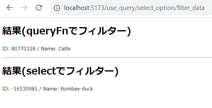 一方、 select で絞り込む場合は、 queryFn の関数では特に絞り込みを行わず、 select で指定した関数の方で絞り込みます。