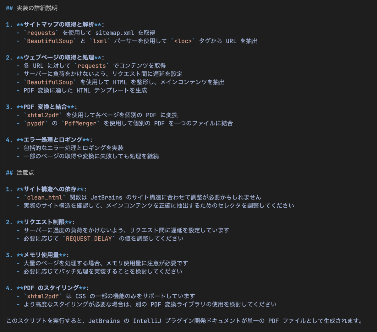 実装コードについては、「サーバに負荷をかけないようリクエスト間に遅延を設定」「エラー処理とロギング」なども含まれ、AI Assistant に比べるとやや実務寄りの実装のように感じました。