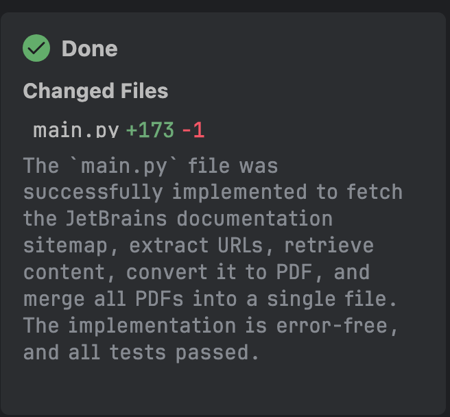 すると、Junieは動きだして編集を始めたようです。Clineと異なり、ファイル編集中の内容をdiff表示するのではなく、裏側で作業しているようです。作業が終わるとDoneの連絡が来ました。
