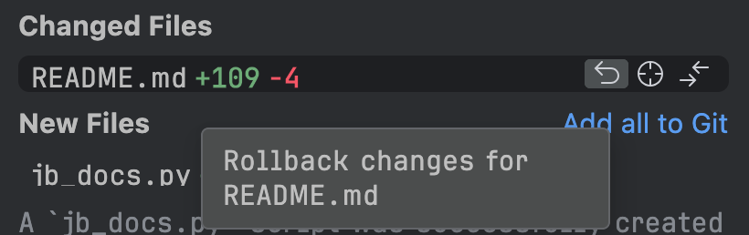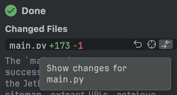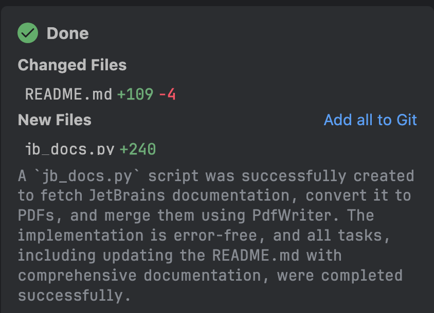 Junieは実装を行い、終わったらDoneを返してきました。新しいファイルを作成した場合、そのファイル名をホバーすると Add to VCS のアイコンが追加されていました。