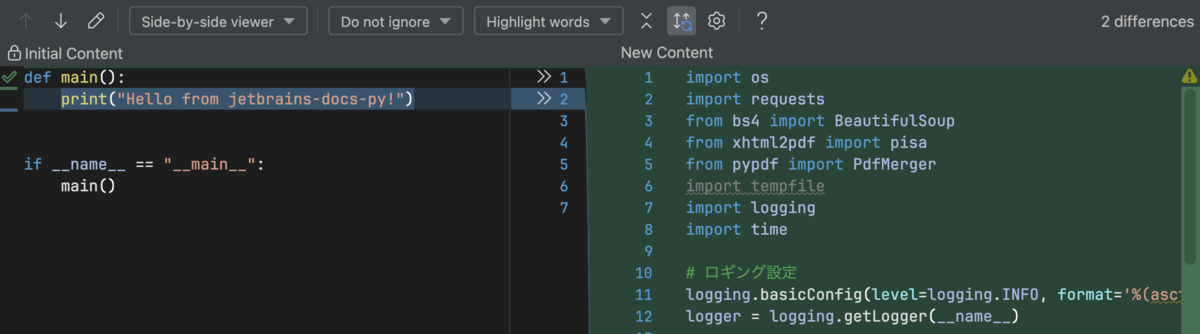 すると、JetBrains IDE上でのdiff確認と同じような、diffを確認できる画面が表示されました。