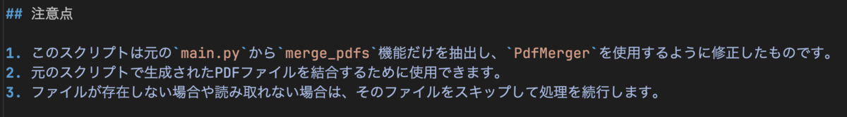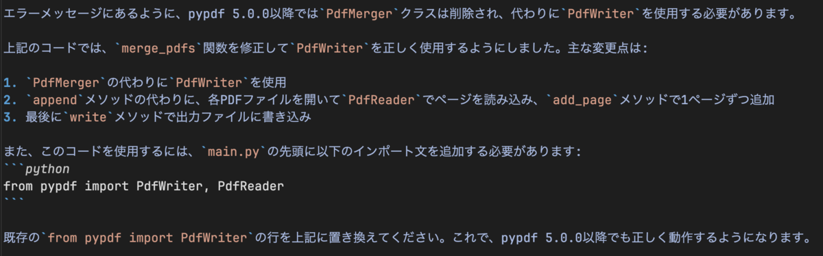 そこで、Ask モードに切り替えて、pdfをマージするだけのPythonスクリプトを設計してもらいました。その際、やんわりと PdfMerger が使えないことも伝えました。