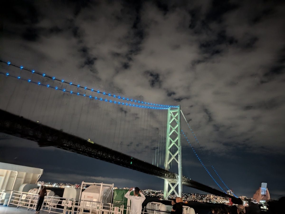 ご飯後は散策をしました。橋を通過する時刻が船内に掲載されていたので、明石海峡大橋の通過を眺めたりしました。意外と橋を近くに感じられて、よく通過したな...と思うなどしました。